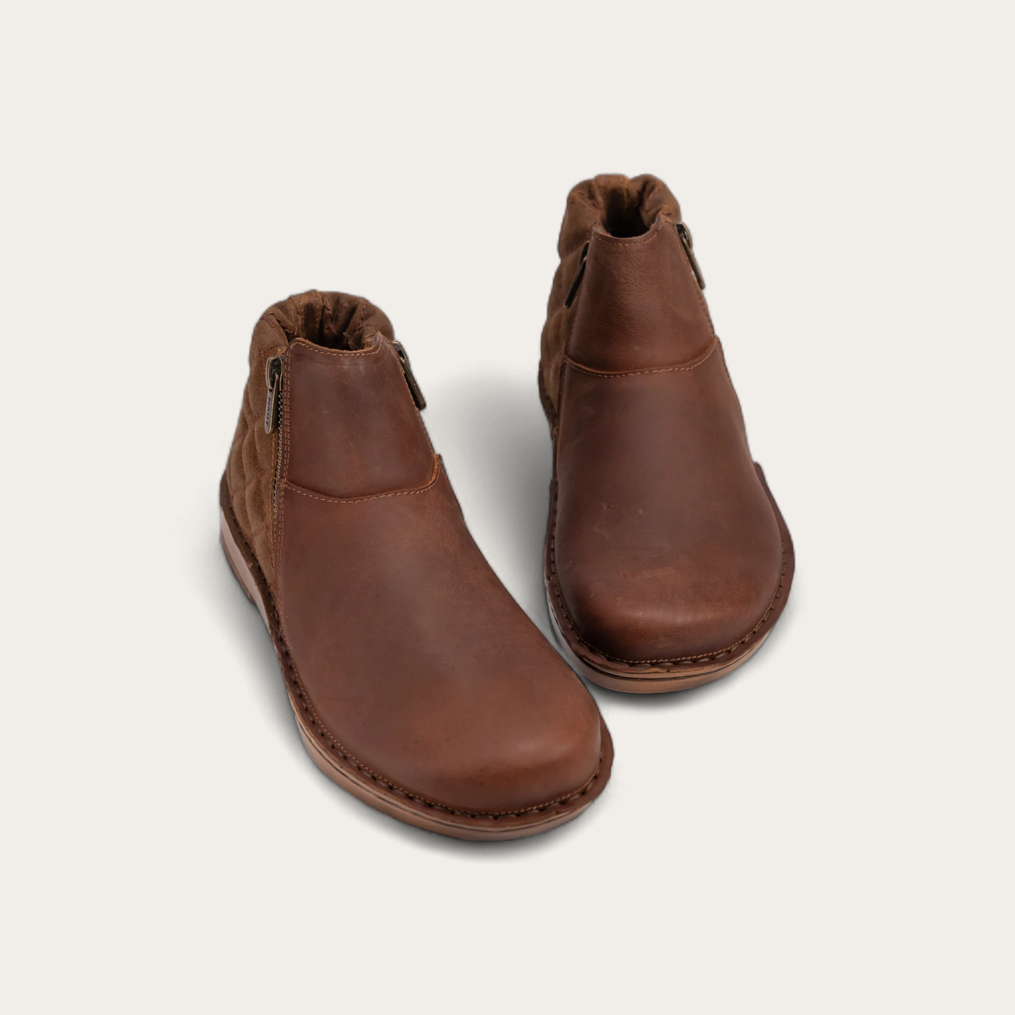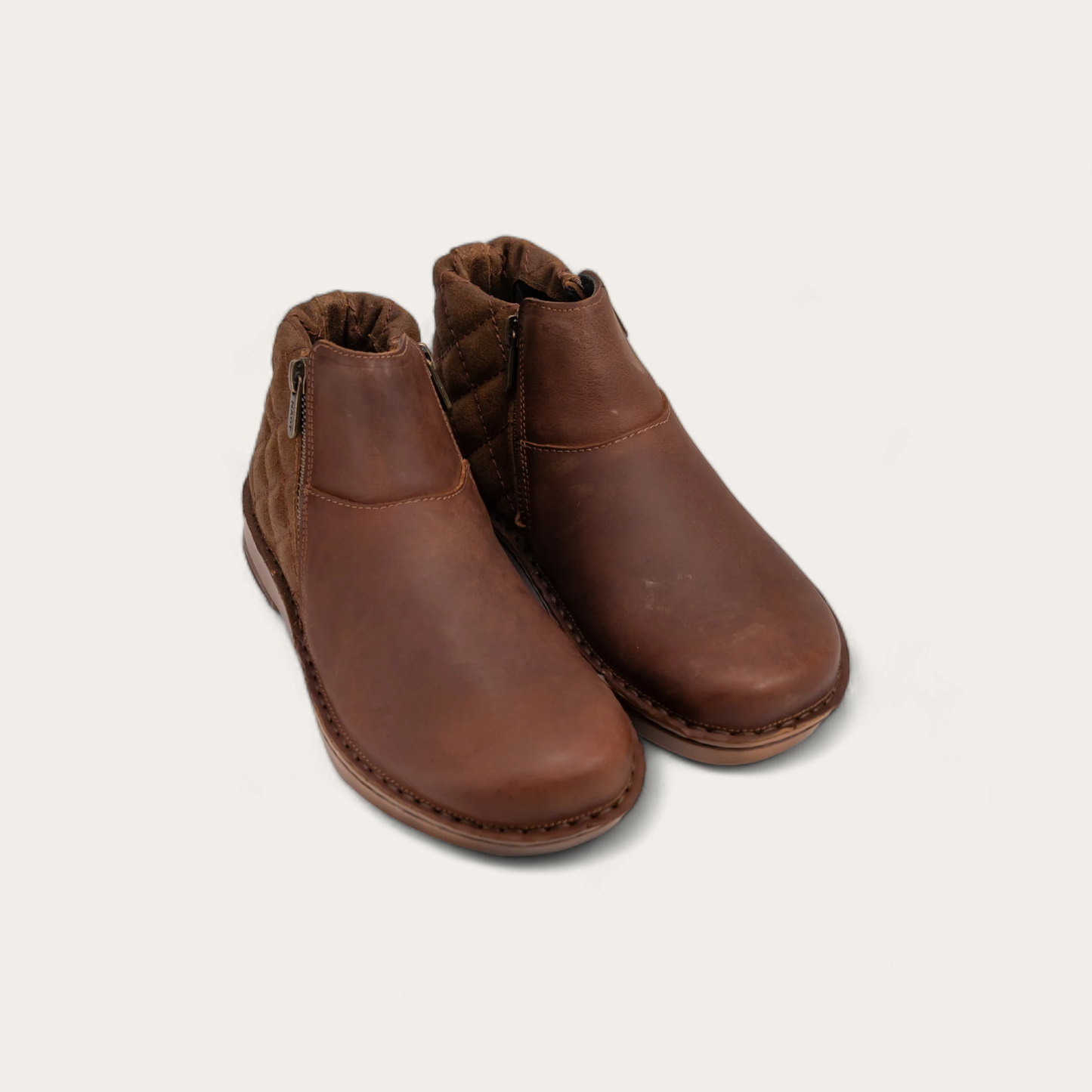 Naot Sintra is a comfy everyday bootie made with soft leather combinations, zipper accent, and quilted details. The Sintra features Naot's anatomic cork and latex footbed is wrapped in a pampering suede and molds to the shape of the foot with wear. American Podiatric Medical Association (APMA) Accepted for promoting good foot health. Sintra fits our Utopia Footbed.