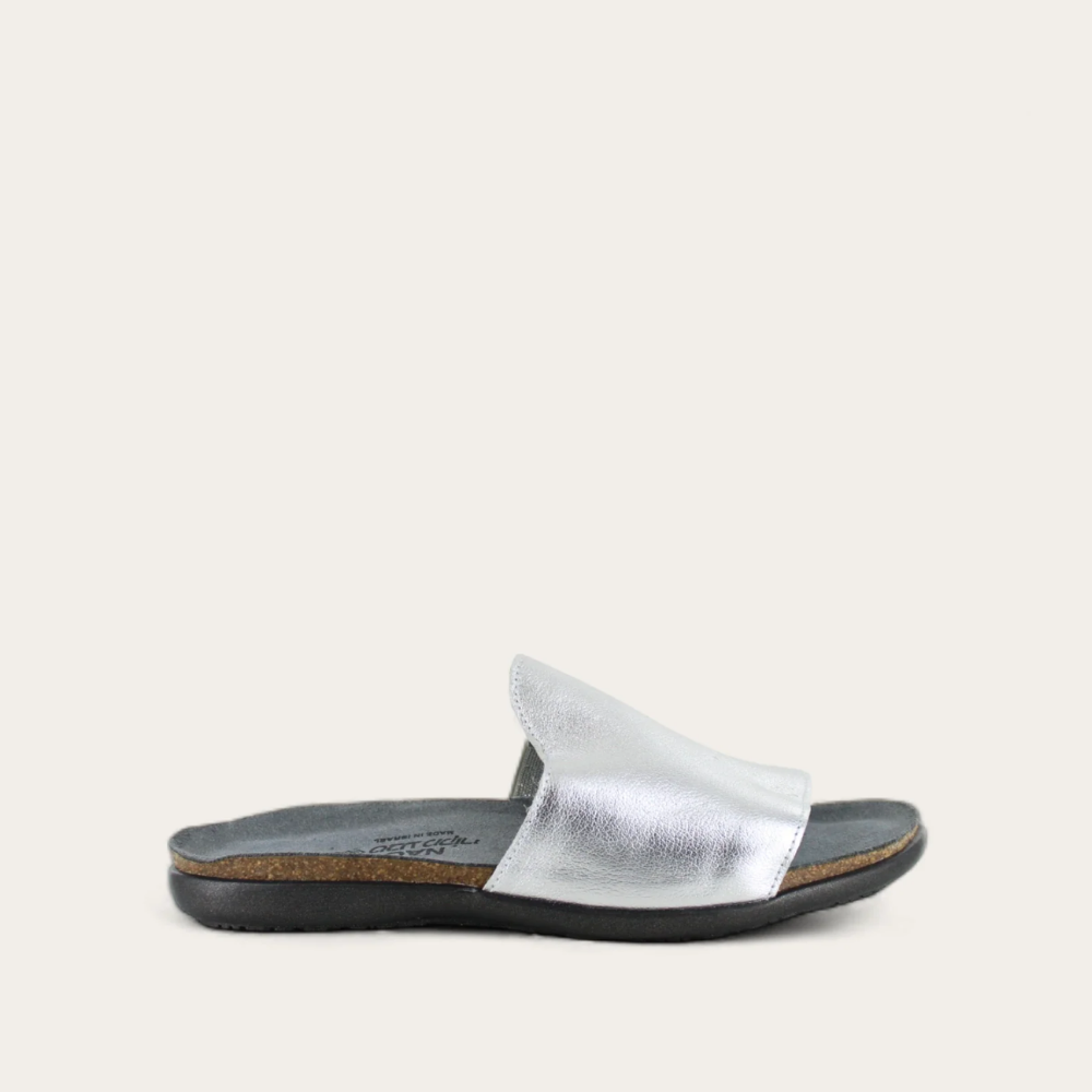 The Naot Skylar is the perfect everyday slip on sandal, with hidden gore for adjustability. Naot's anatomic cork and latex footbed is wrapped in a pampering suede and molds to the shape of the foot with wear. The Flat Elegant Collection features a .75" TPR sole.