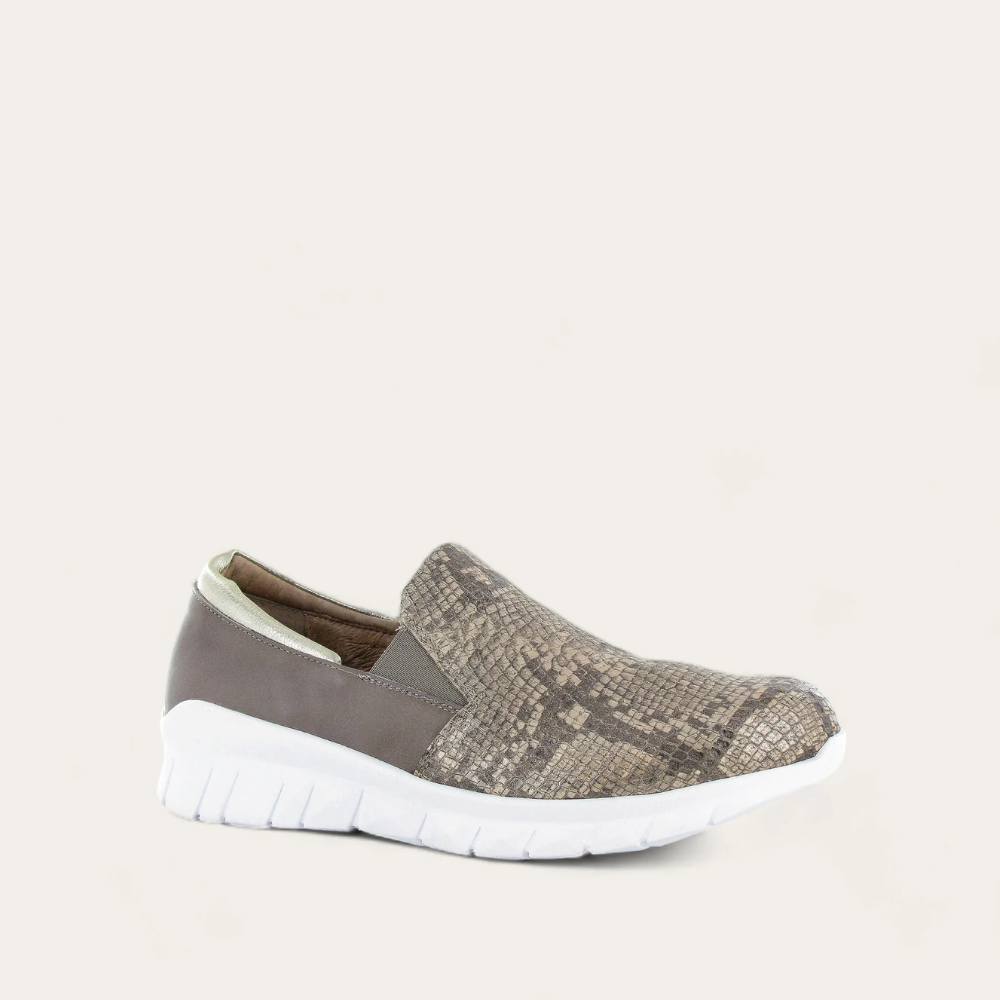 A fashionable, sneaker inspired slipon, the Titan has a removable cork and latex footbed that provides all-day comfort. This shoe features a 1.5" slip resistant sole and gore for accessibility. American Podiatric Medical Association (APMA) Accepted for promoting good foot health. The Titan fits our Aura Footbed.