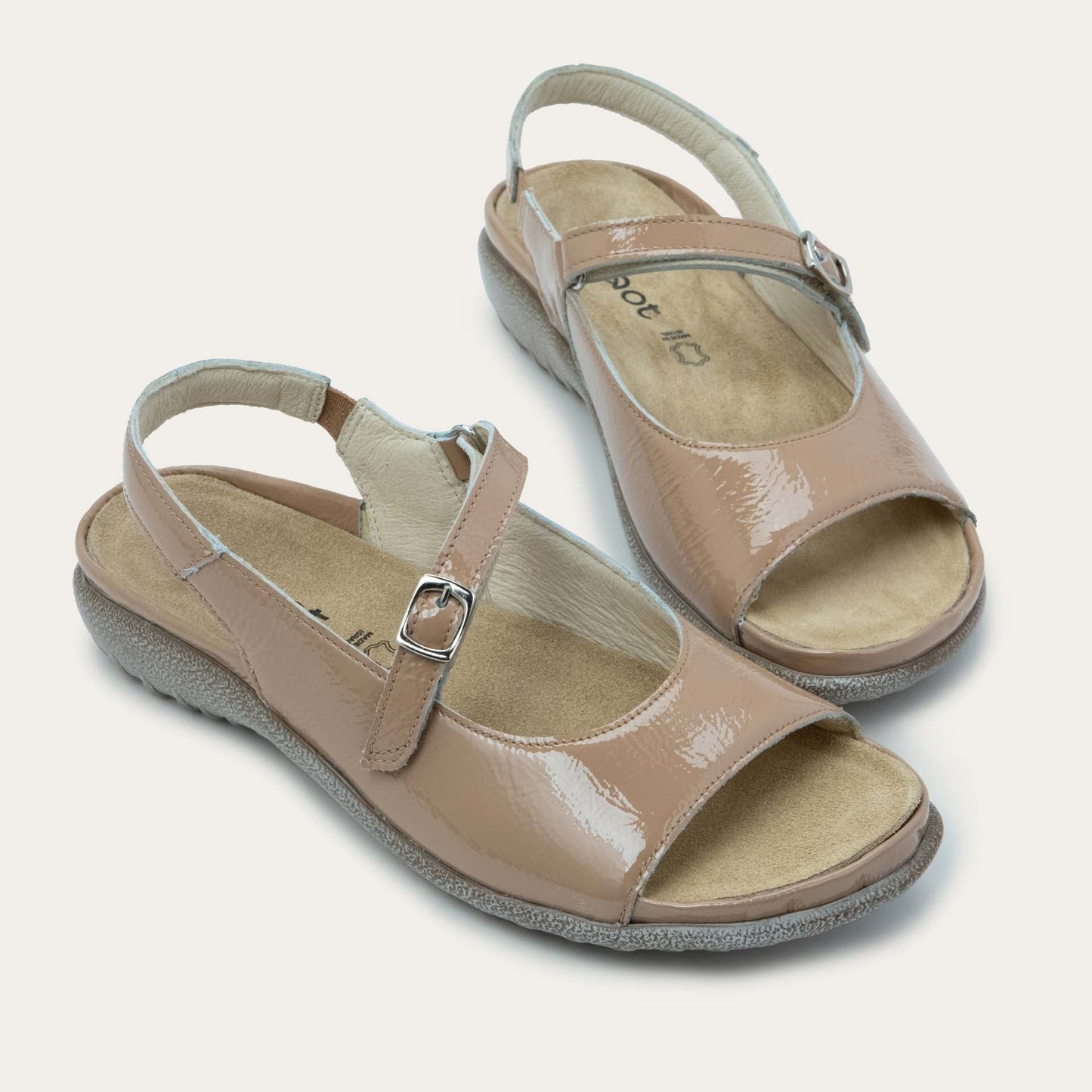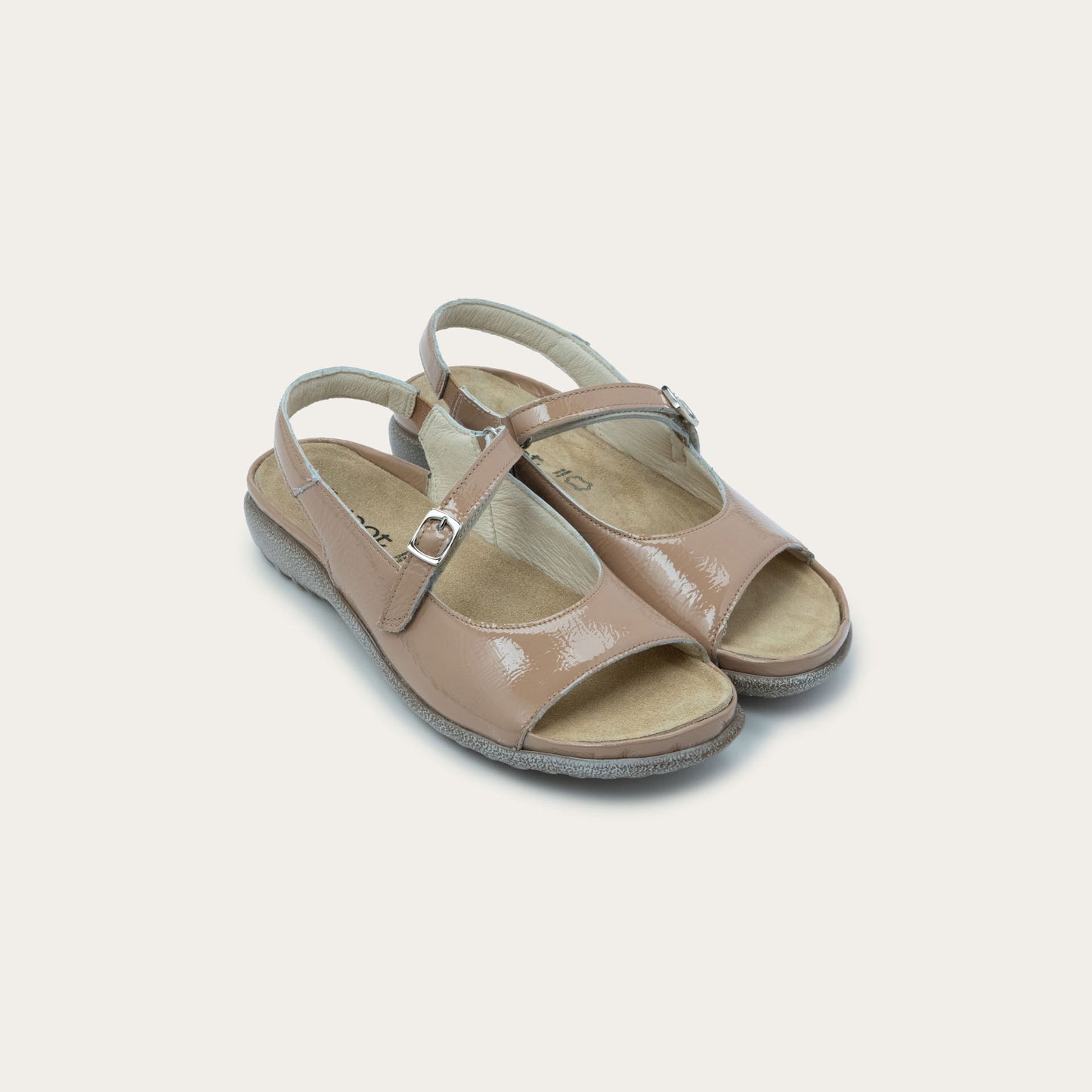 This is the perfect shoe for any occasion. It can be worn with dresses to church or out to dinner, or it can be worn with jeans and any kind of pants. The patent leather and neutral shade make it the perfect summer shoe. Besides that, it rates 10+ in comfort!