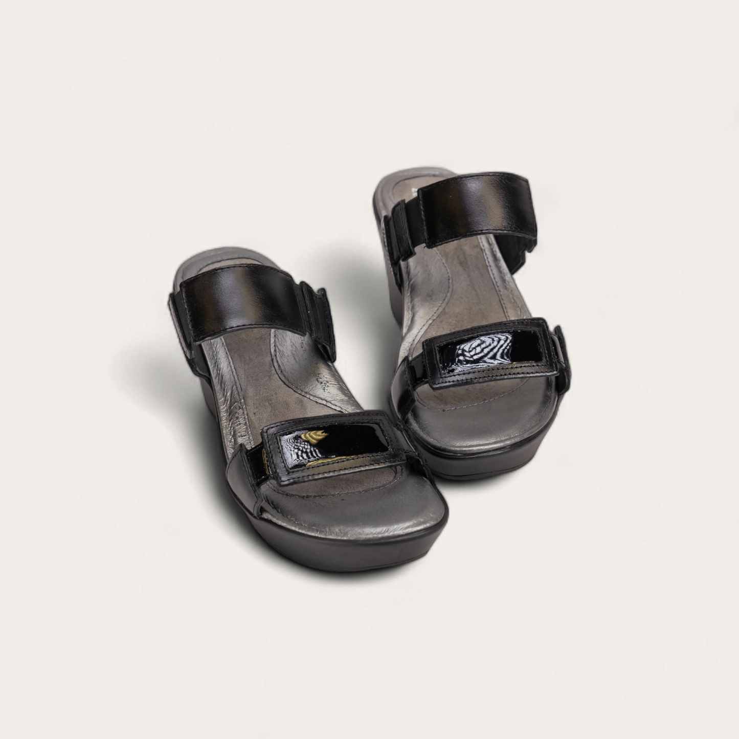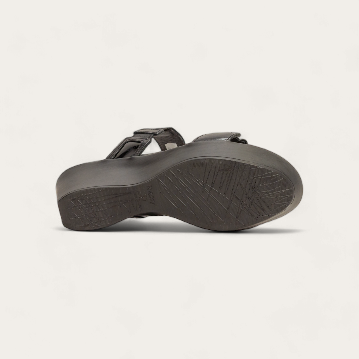 The Treasure is a fashionable 2.75 inch wedge with contrasting patent leathers. This sandal has gore at the instep for adjustability and a slightly padded upper. Naot's anatomic cork and latex footbed is wrapped in leather with a microfiber center to prevent slipping and molds to the shape of the foot with wear. The Impulse Collection features a TPR sole which is extremely lightweight. This sole offers the look of a 2.75 inch wedge without the feel.