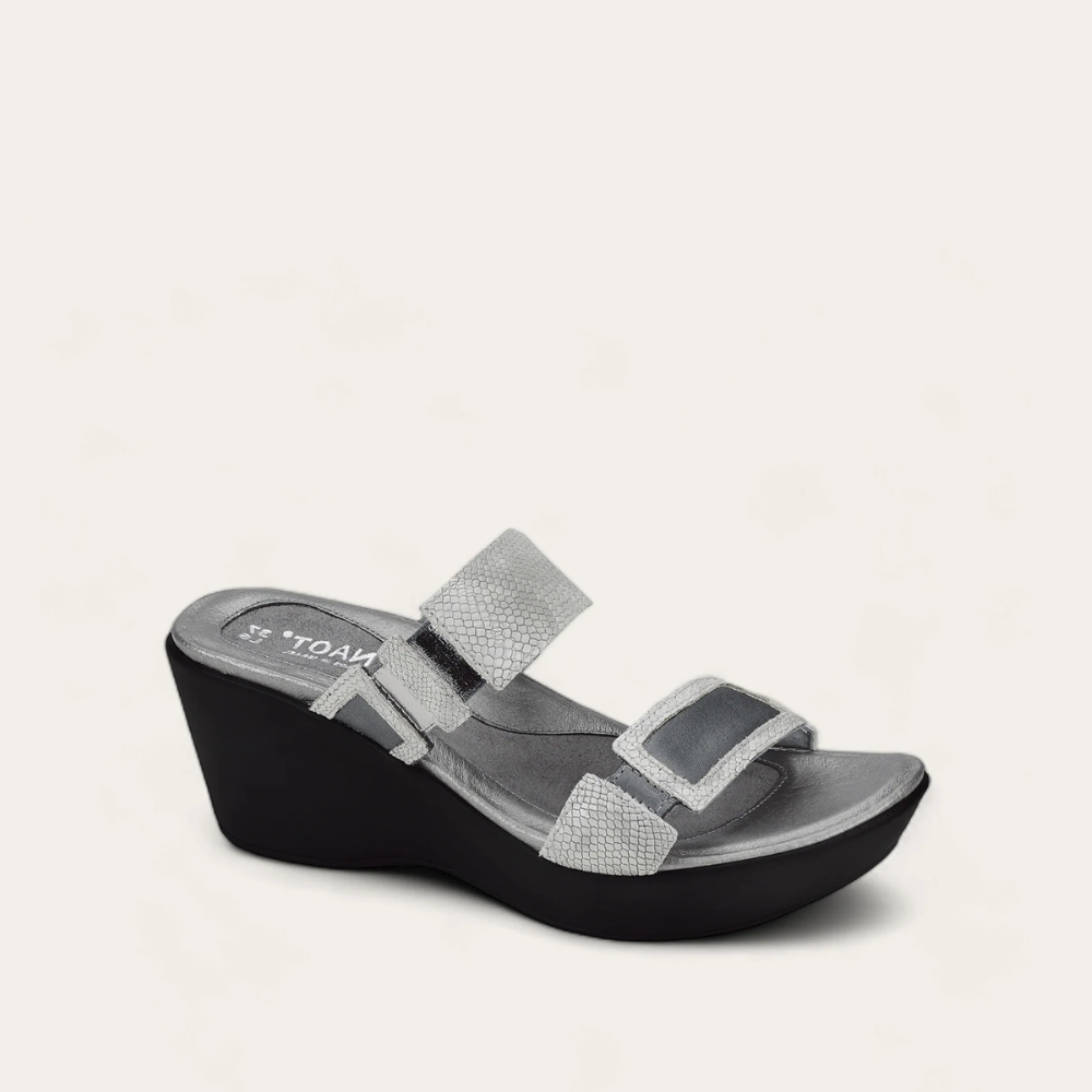 The Treasure is a fashionable 2.75 inch wedge with contrasting patent leathers. This sandal has gore at the instep for adjustability and a slightly padded upper. Naot's anatomic cork and latex footbed is wrapped in leather with a microfiber center to prevent slipping and molds to the shape of the foot with wear. The Impulse Collection features a TPR sole which is extremely lightweight. This sole offers the look of a 2.75 inch wedge without the feel.