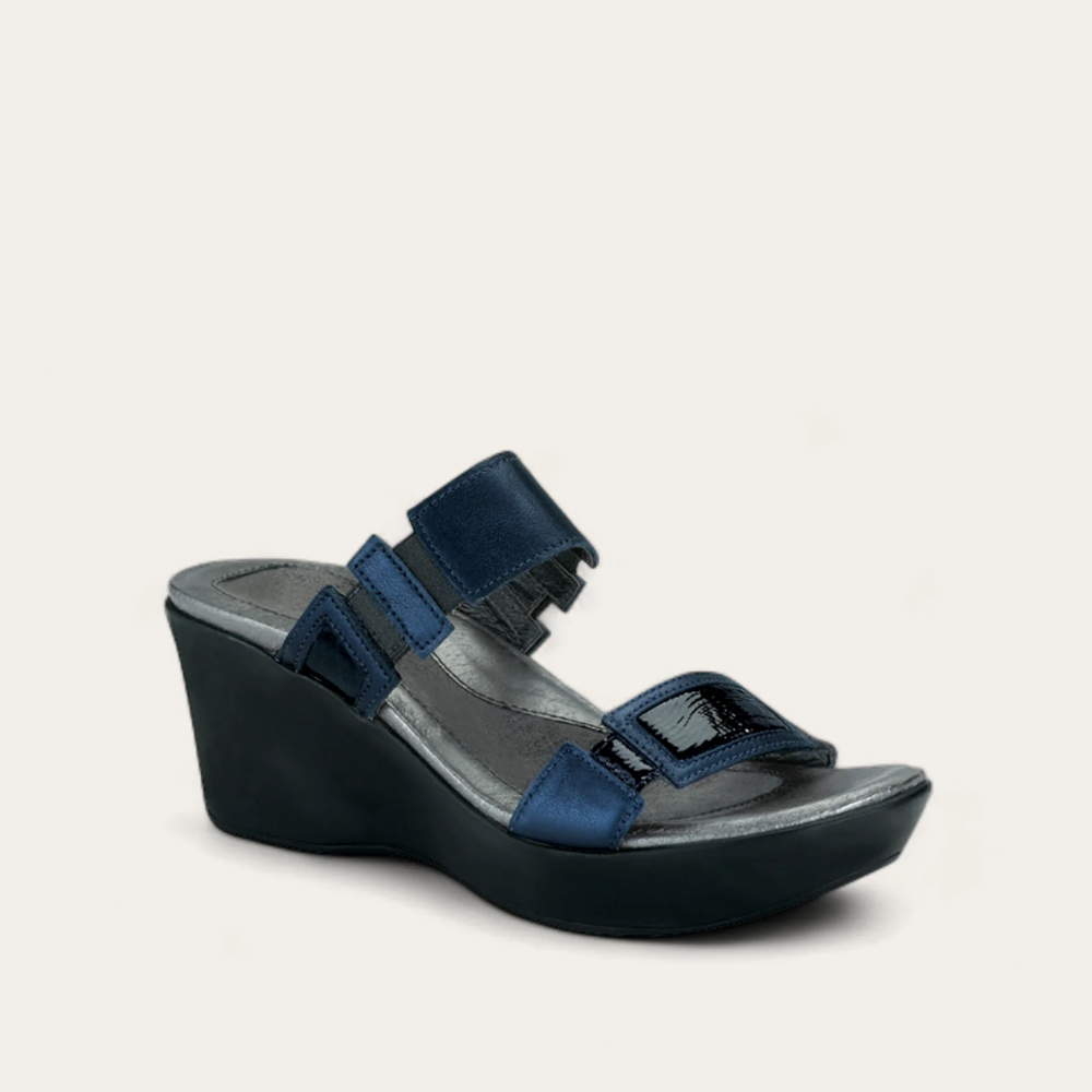 The Treasure is a fashionable 2.75 inch wedge with contrasting patent leathers. This sandal has gore at the instep for adjustability and a slightly padded upper. Naot's anatomic cork and latex footbed is wrapped in leather with a microfiber center to prevent slipping and molds to the shape of the foot with wear. The Impulse Collection features a TPR sole which is extremely lightweight. This sole offers the look of a 2.75 inch wedge without the feel.