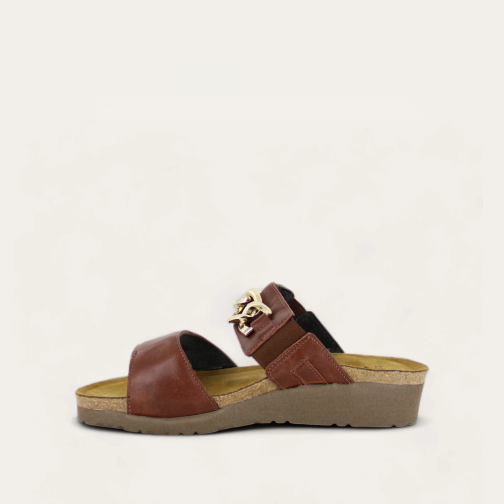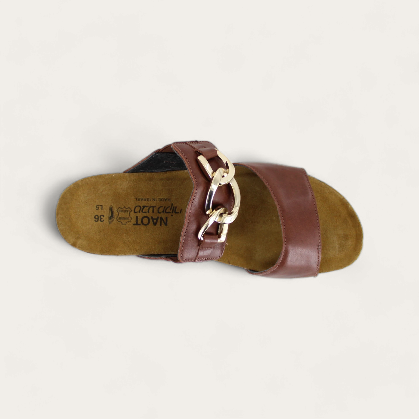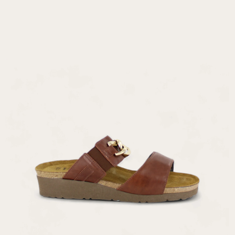 The Victoria is a versatile slide sandal to go from day to night, featuring a bold chain. Naot's anatomic cork and latex footbed is wrapped in a pampering suede and molds to the shape of the foot with wear. American Podiatric Medical Association (APMA) Accepted for promoting good foot health.