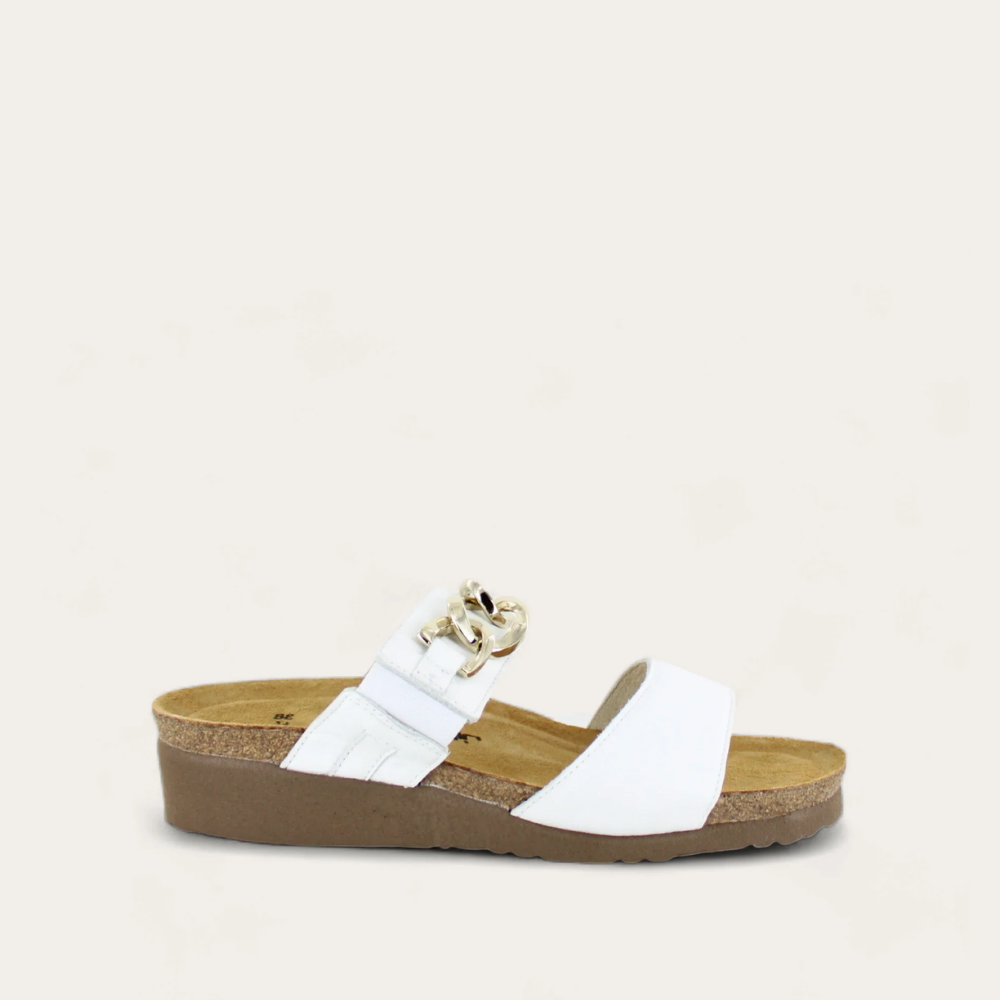 The Victoria is a versatile slide sandal to go from day to night, featuring a bold chain. Naot's anatomic cork and latex footbed is wrapped in a pampering suede and molds to the shape of the foot with wear. American Podiatric Medical Association (APMA) Accepted for promoting good foot health.