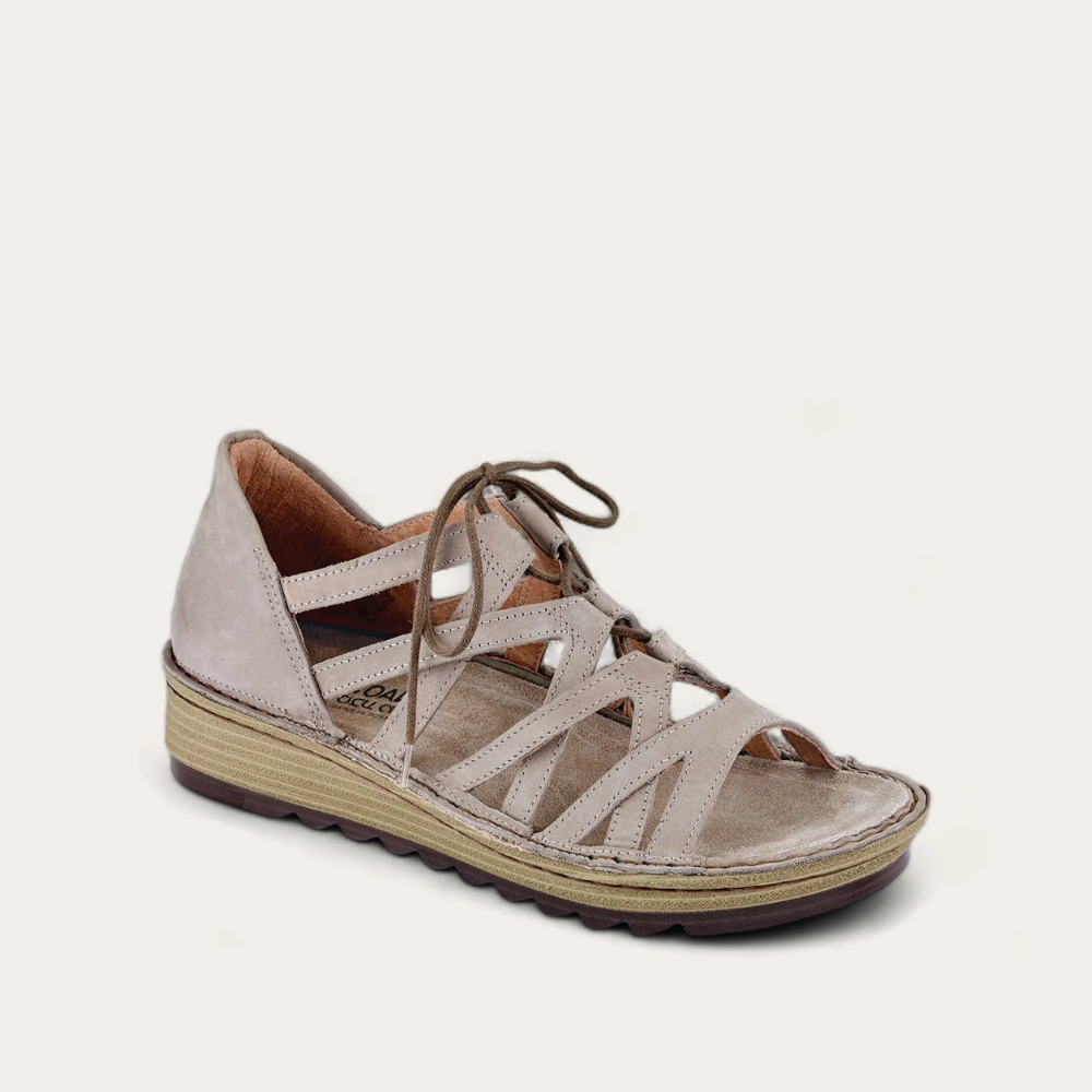 The Yarrow is an on trend ghillie lace up sandal. This style has a padded heel cup for ultimate comfort and laces for accessibility. Naot's removable, anatomic cork and latex footbed is wrapped in pampering suede and molds to the shape of the foot with wear. The Bloom Collection features a 1.75'' polyurethane sole which is extremely lightweight, and durable. Our patented Naot Replacement Footbeds are also available for Yarrow.