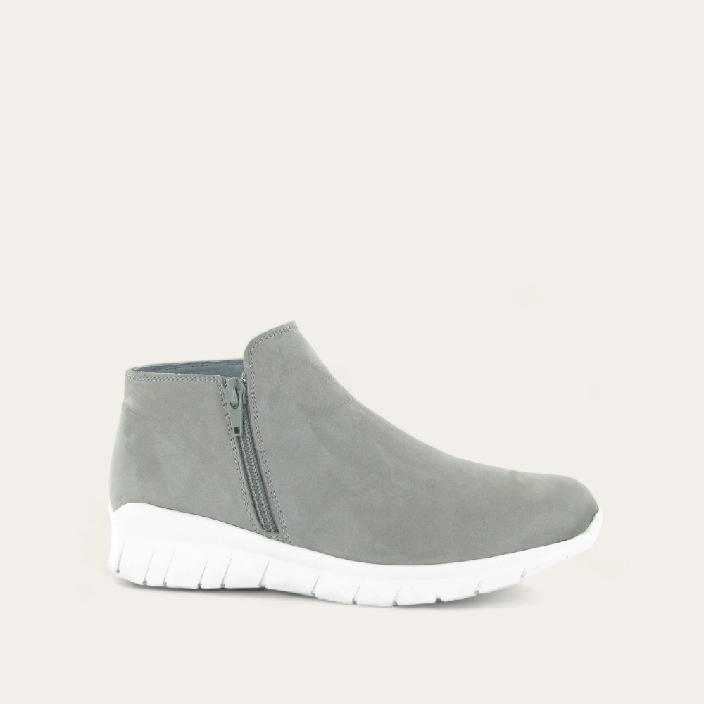 The Zodiac shoe showcases classic shades of smooth nubuck with an eye catching white, slip resistant sole. A cork and latex removable footbed provides all-day comfort. This style contains double zippers for easy on/off and also features padded technical lining for extra comfort. American Podiatric Medical Association (APMA) Accepted for promoting good foot health. The Zodiac fits our Aura Footbed.